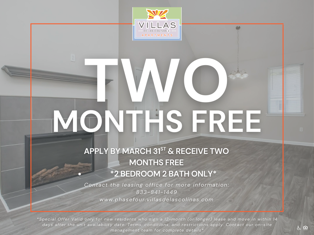 Apply by March 31st & receive two months free on 12+ month leases! Contact the Leasing Office for more information!⤵️ *2 bedroom 2 bath only* ¡Aplica antes del 31 de Marzo y recibe dos meses gratis!¡Contacta con la oficina de arrendamiento para más información!⤵️ *Solo apartamentos de 2 dormitorios y 2 baños.*